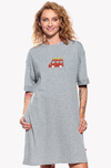 Lockeres A-Schnitt-Kleid durch ein interessantes Nahtdetail verziert, das an den Ärmeln einen "auf links" Effekt erzeugt. Die Kleider haben Taschen und lässige, längere kurze Ärmel.