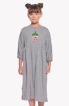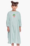 Knee-length girl dress with pleats on the front and back. Comfortable 7/8 lenght sleeves are finished with an elastic band. The dress has pockets.