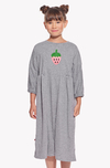 Térdig érő ruha elöl és hátul ráncokkal. A kényelmes, 7/8 hosszúságú ujjak elasztikus szalaggal vannak lezárva. A ruhán zsebek vannak.