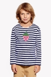 Materiál: 100% bavlna 170grFarba: pruhy tmavomodrej farby – šírka cca 1cmPískacia nášivka vyrobená z koženky