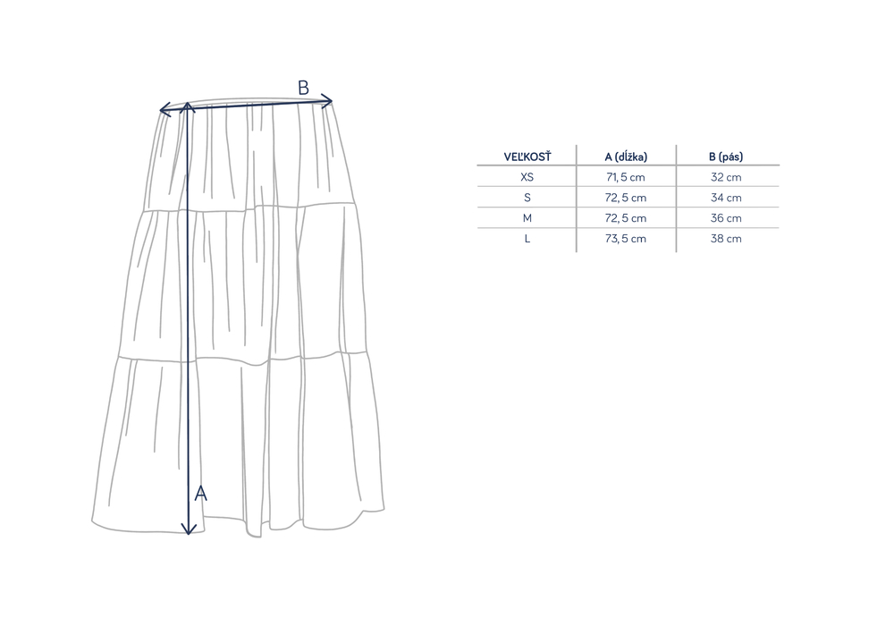 Dlhšia midi sukňa s volánovým efektom, bohato riasená, mierne do A. V páse riešená gumou, nikde preto netlačí, ani neodstáva.