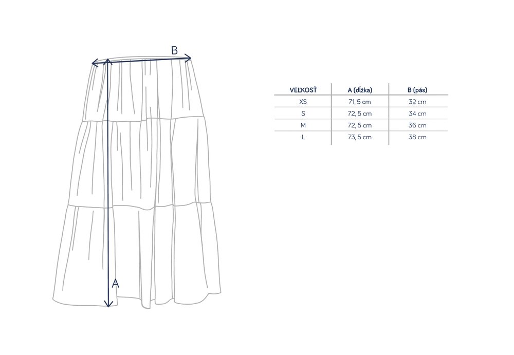 Delší midi sukně s volánovým efektem, bohatě řasená, mírně do A. V pase na gumu, nikde proto netlačí ani neodstává.
