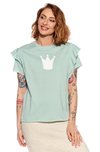 Dámské tričko s volánovými rukávy, volnější regular střih. Za jeho nedokončený vzhled může surové stříhání. Po praní se okraje mírně rolují.