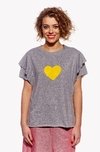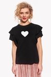 Dámské tričko s volánovými rukávy, volnější regular střih. Za jeho nedokončený vzhled může surové stříhání. Po praní se okraje mírně rolují.