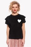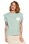 Női póló, laza szabással és fodros ujjakkal. A befejezetlen megjelenést a laza szabás okozza. Az élek a mosás után egy kicsit tekerhetnek. A modell 165 cm magas, és S méretű.