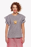 A women's T-shirt with a loose regular cut and frilled sleeves. The unfinished look is caused by the rough cutting. The edges may roll a bit after washing. The model is 165 cm tall and wearing a size S.