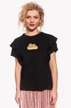 A women's T-shirt with a loose regular cut and frilled sleeves. The unfinished look is caused by the rough cutting. The edges may roll a bit after washing. The model is 165 cm tall and wearing a size S.
